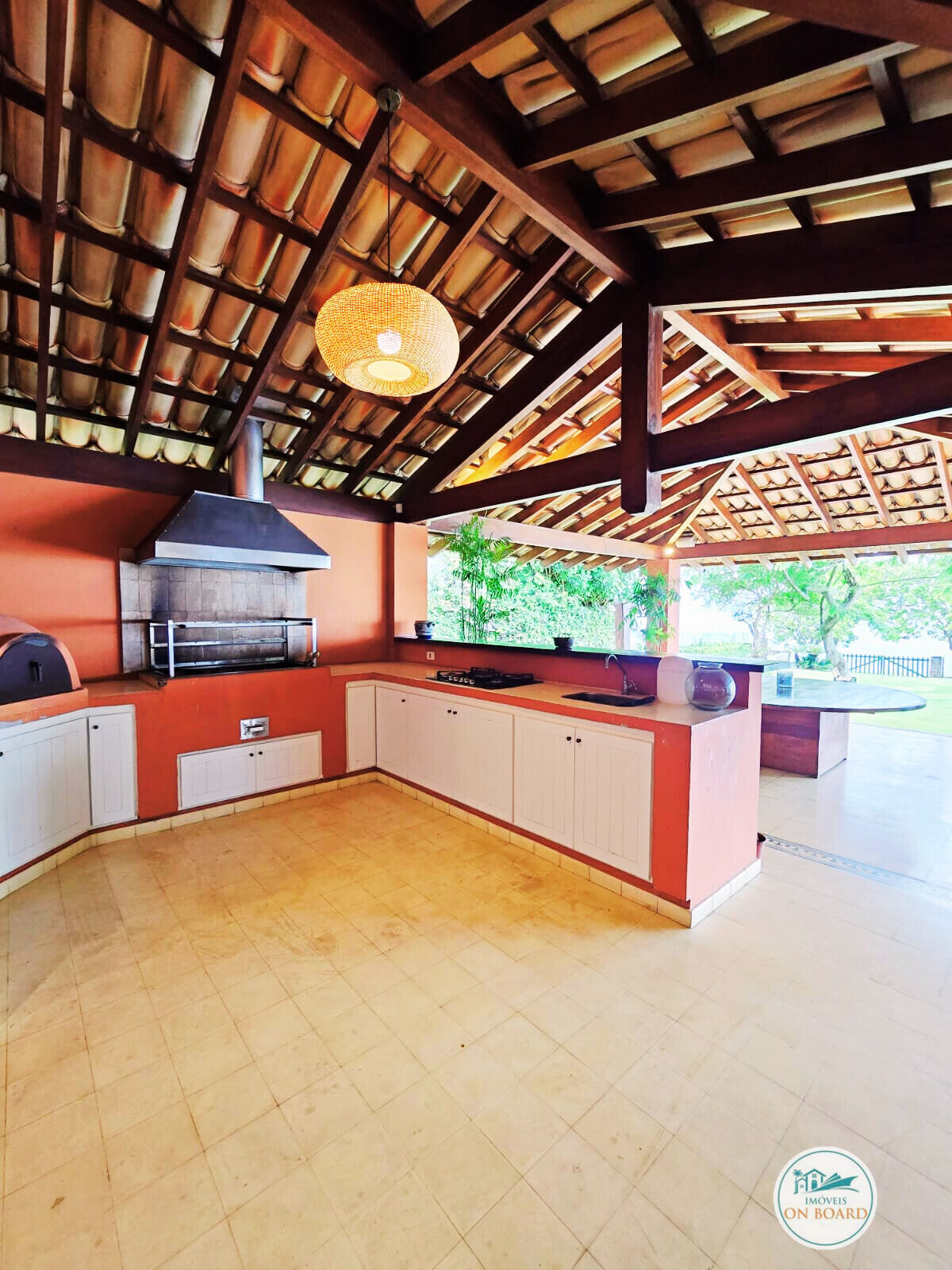 A experiência gastronômica é um dos grandes destaques do imóvel. A propriedade dispõe de cozinha gourmet, área gourmet completa com churrasqueira e forno de pizza, sala de jantar externa e churrasqueira de fogo de chão, proporcionando momentos únicos ao ar livre em um cenário incomparável. A casa principal conta ainda com despensa ampla e lavanderia com suíte de serviço.